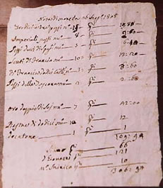 26.05.1808 "Nota di monete date a D. Bernardino". Dall'elenco risultano le monete in oro correnti nel Regno delle Due Sicilie tanto in ducati quanto in titoli di altri Stati riportati al valore di ducati.